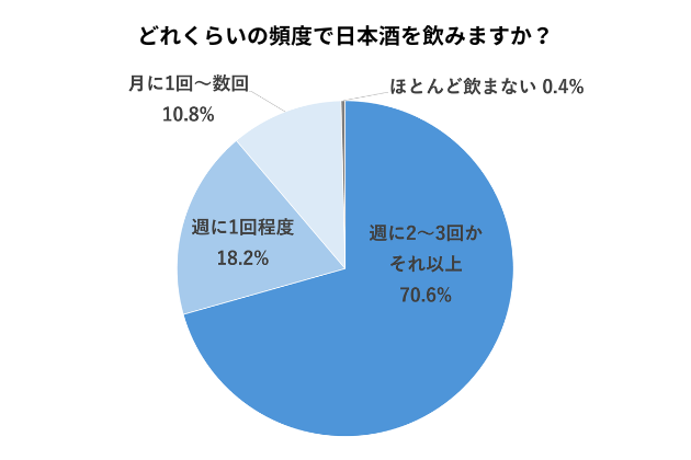 日本酒を飲む頻度の質問には週に2〜3回、もしくはそれ以上の頻度で日本酒を飲むと答えた人が70.6%。「家で飲むために日本酒を購入することがあるか」という質問には「ある」が97.8%と、日常的に日本酒を購入・消費しているコアな消費者層が多数派となっています。