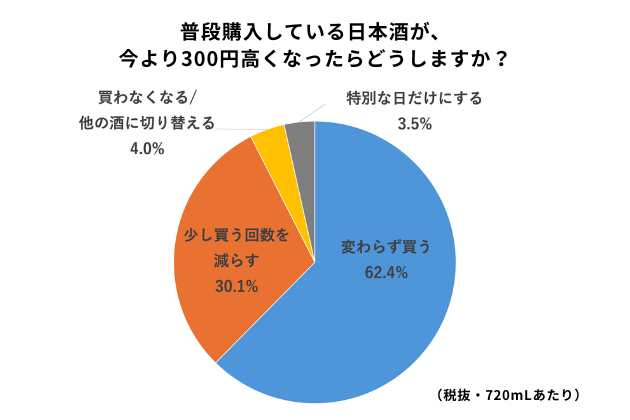 はじめに、酒販店で購入する日本酒の許容範囲を知るため、「普段購入している日本酒(四合瓶)が、今より300円高くなったらどうするか」という質問をしました。すると、「変わらず買う」と回答した人が62.4%と、過半数を占める結果となりました。