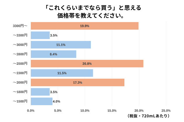 では、具体的に「四合瓶で『これくらいまでなら買う』と思える価格帯(税抜)」についての回答を見てみましょう。
