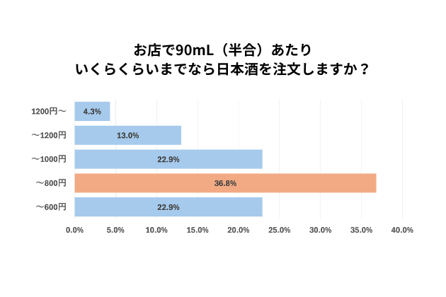 酒販店での価格に加え、「お店で「90mL(半合)あたりいくらくらいまでなら日本酒を頼む」と思いますか?(税抜)」という質問もおこないました。
