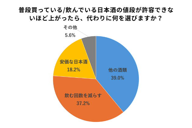 最も多かった回答はビールやワインなどの「ほかの酒類を飲む」で、39% を占めました。次いで、「飲む頻度を減らす」が37.2% 。「安価な日本酒を買う」と回答した人は18.2% にとどまりました。
